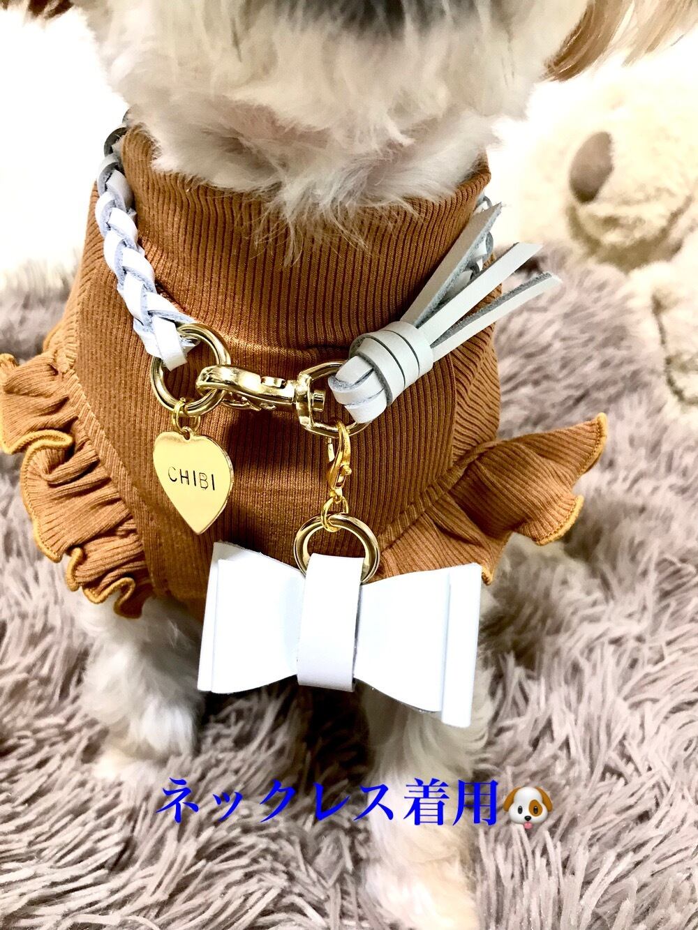 ダブルリボンと真鍮ネームタグ付き首輪、ネックレスです。