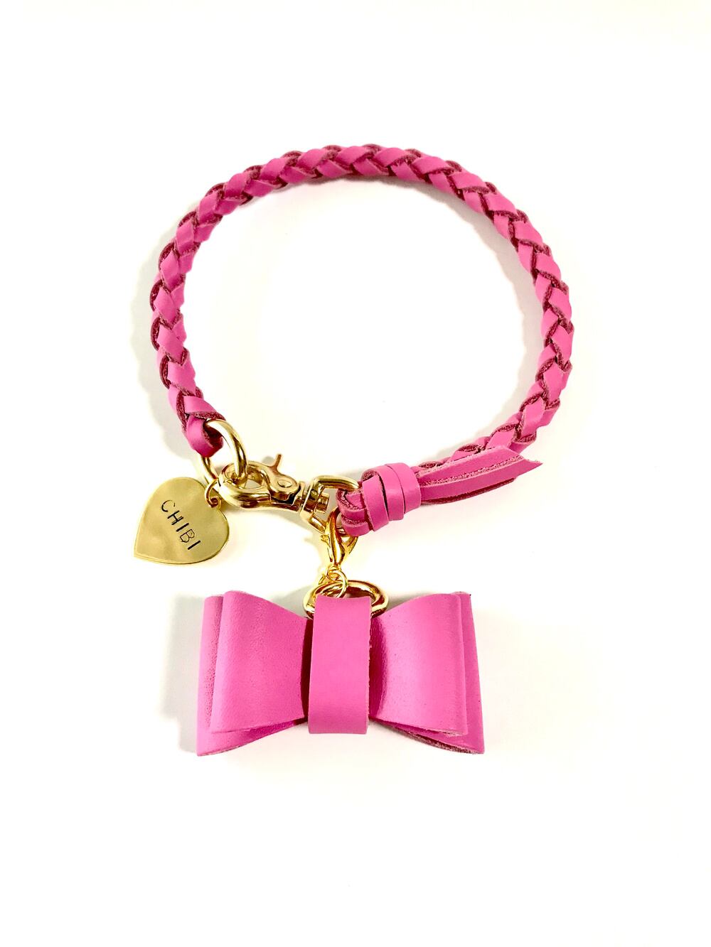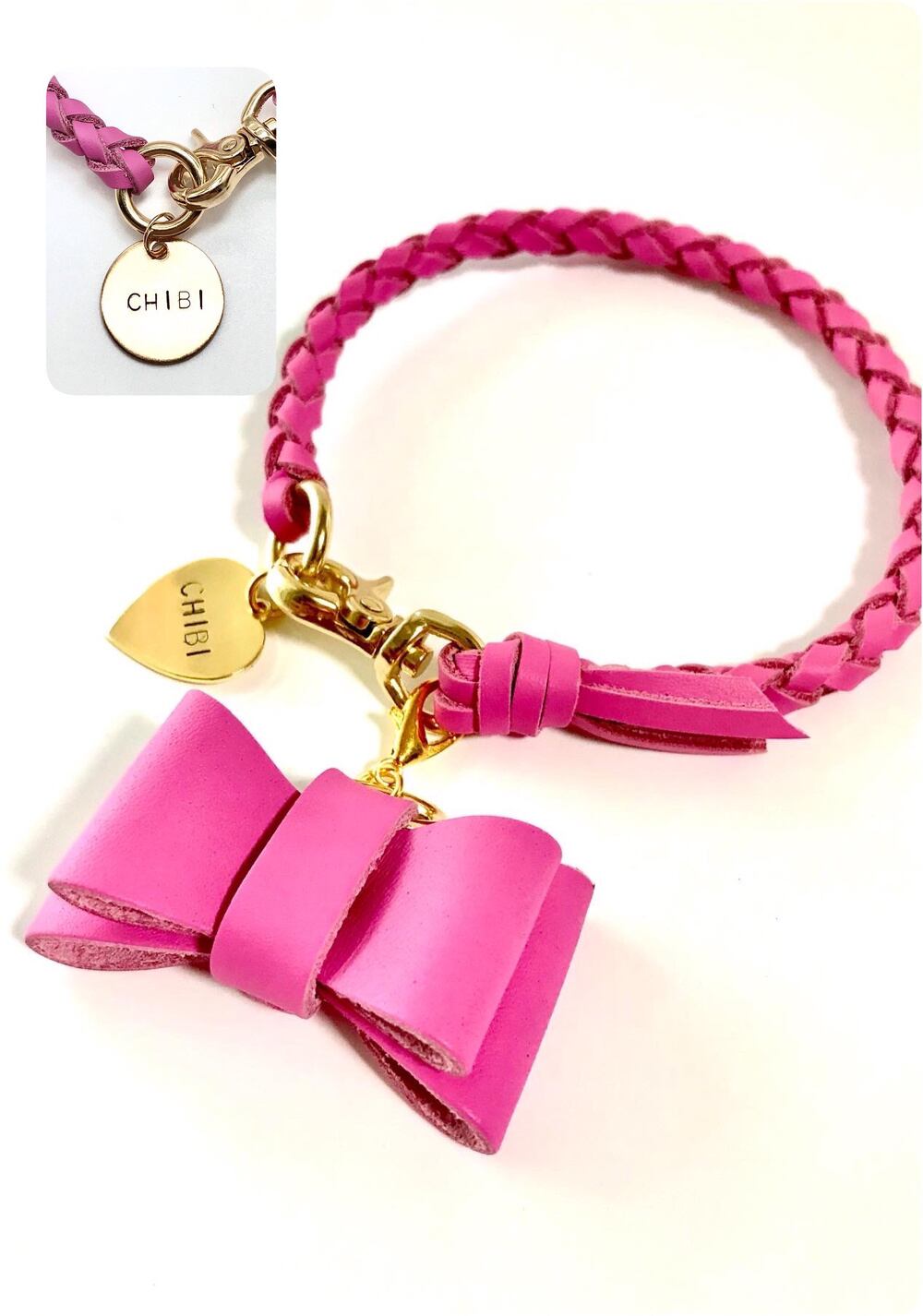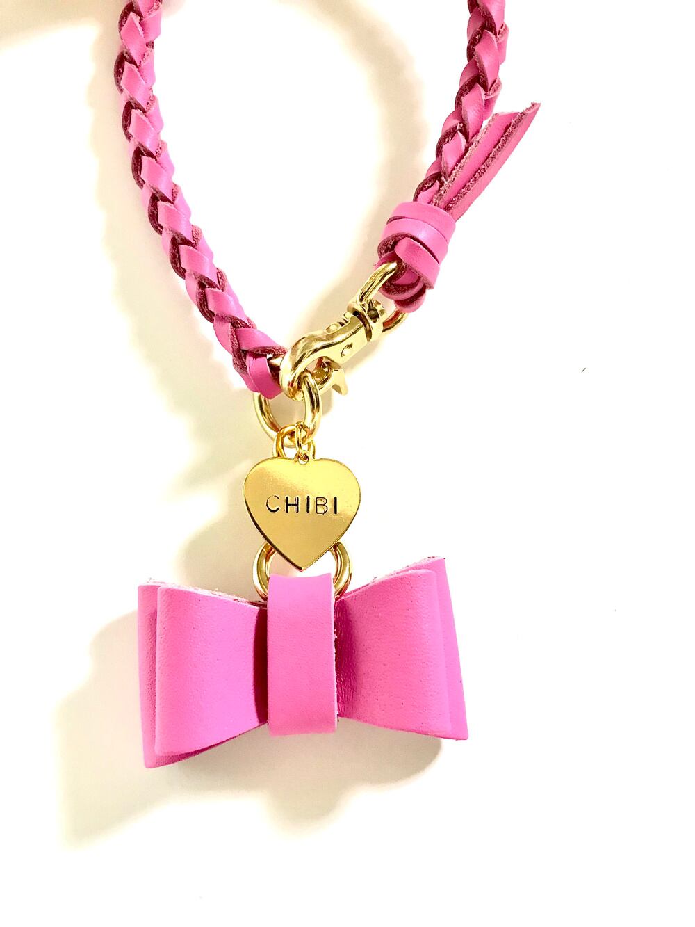 ダブルリボンと真鍮ネームタグ付き首輪、ネックレス ピンク 革レザー