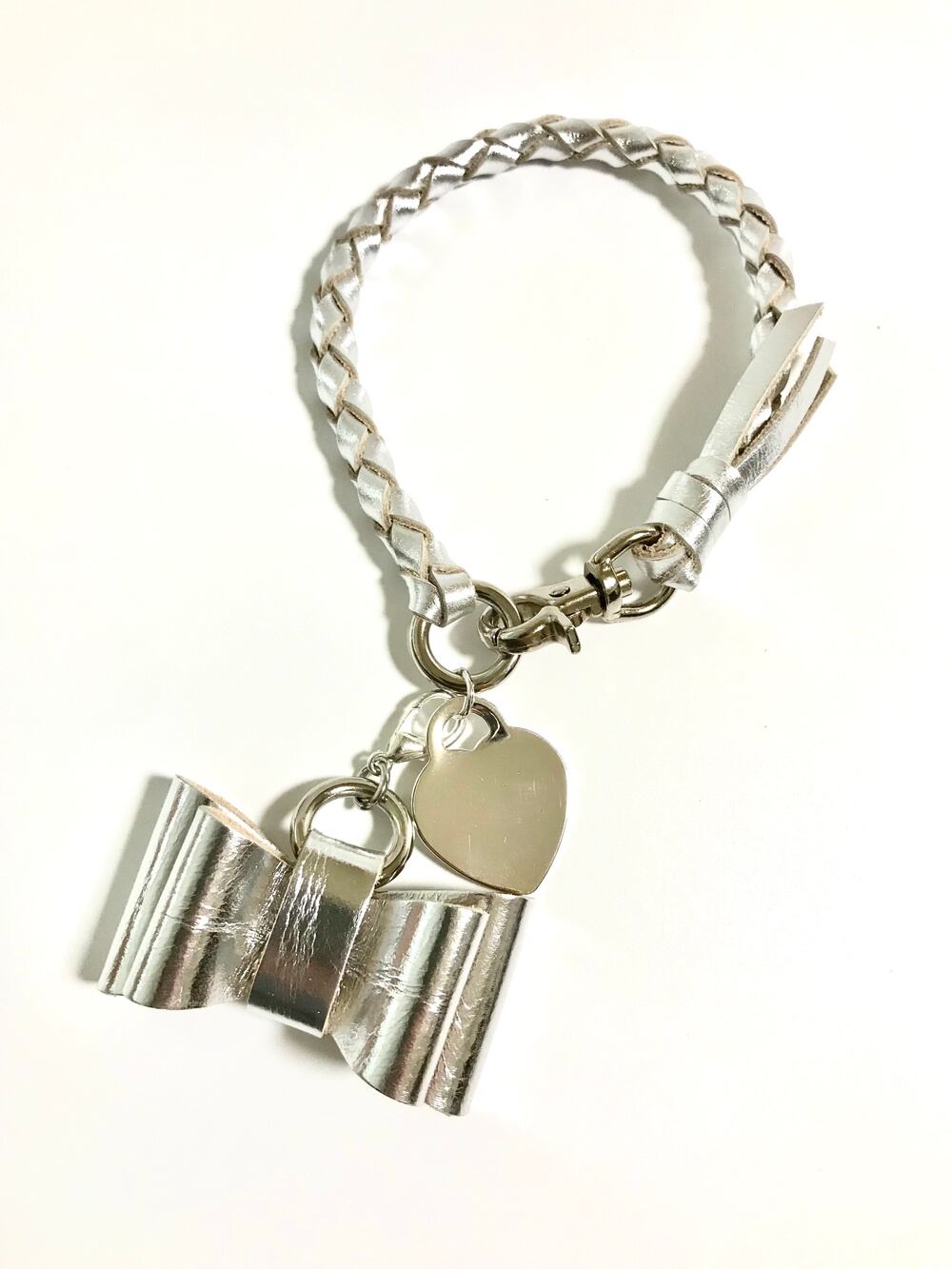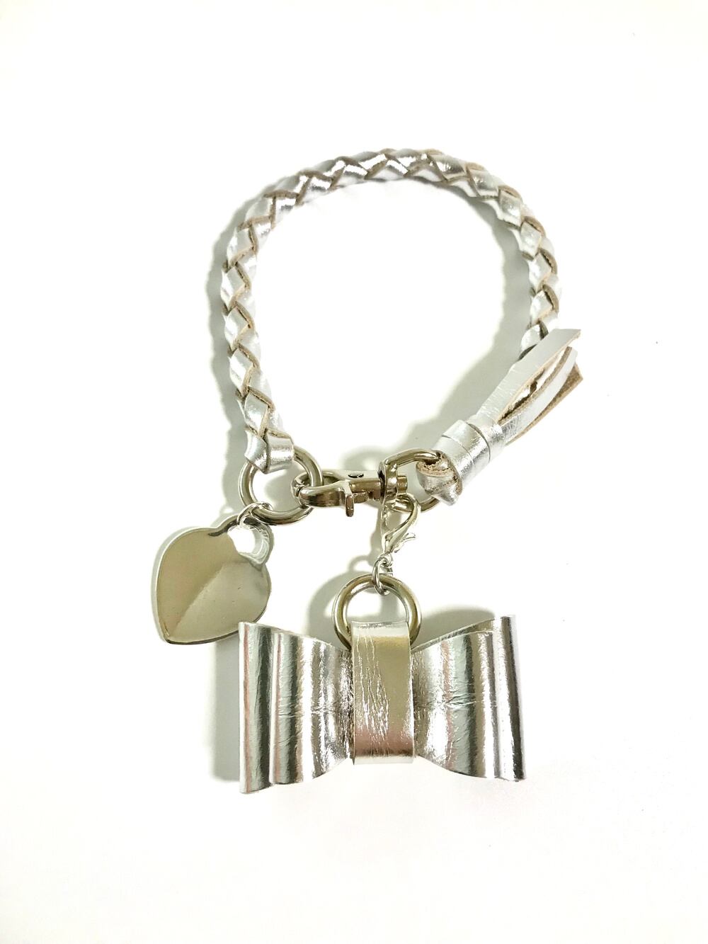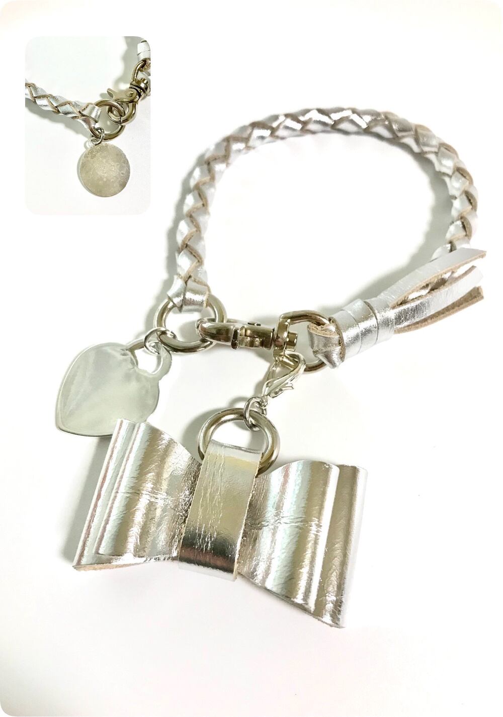 ダブルリボンと真鍮ネームタグ付き首輪、ネックレス シルバー 革レザー
