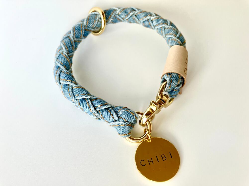 淡色デニム 真鍮ネームタグ付き首輪、ネックレス 革レザー